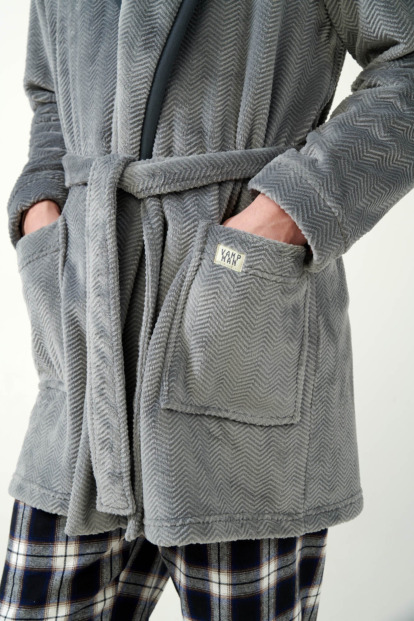 - Μακρυμάνικη ανδρική ρόμπα φλις κοντή. Μοναδικό στυλ με σχέδιο ψαροκόκκαλο.