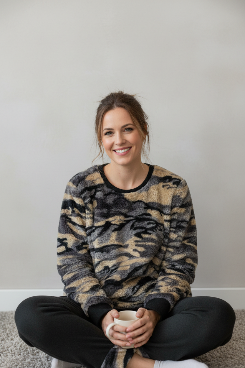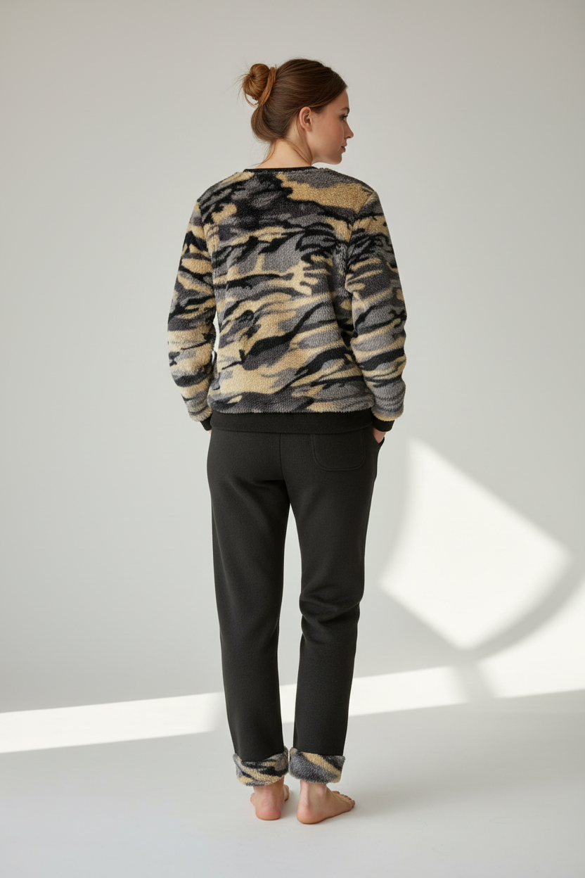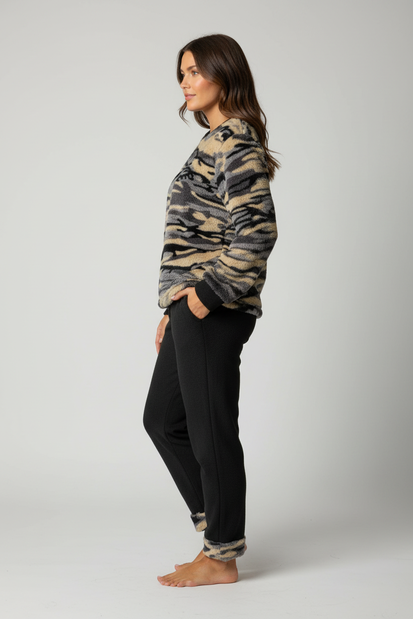 Ένα εξαιρετικά ζεστό fleece σετ πιτζάμας που συνδυάζει animal print μπλούζα με μαύρο παντελόνι. Το tiger print σε αποχρώσεις μπεζ, γκρι και μαύρο και το πολύ μαλακό fleece ύφασμα εξασφαλίζουν μέγιστη ζεστασιά και άνεση.