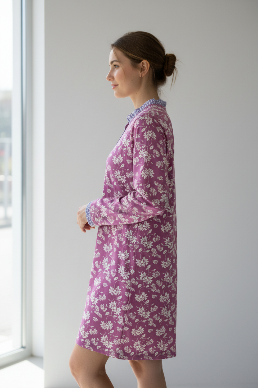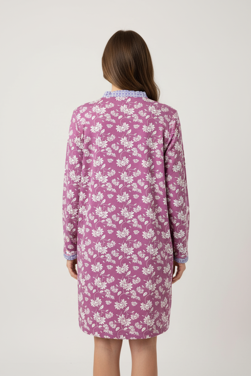Ένα κλασσικό νυχτικό που συνδυάζει άνεση και θηλυκότητα με το ρομαντικό floral μοτίβο του. Το μωβ-ροζ χρώμα με τα λευκά λουλούδια δημιουργεί μια γλυκιά, χαλαρωτική αισθητική, ενώ οι λεπτομέρειες καρό στο γιακά και τις μανσέτες προσθέτουν μια playful πινελιά.