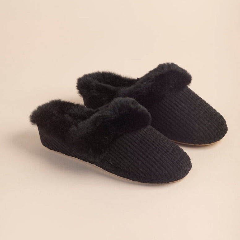 Γυναικείες παντόφλες γούνινες ανοιχτές, σε μαύρο χρώμα. Κανονική γραμμή σε δύο μεγέθη για καθημερινή χρήση. Ημίσκληρος πάτος καλής ποιότητας που δε γλιστράει. Σύνθεση: 100% POL. Συνδυάστε με την απίθανη πιτζάμα της....