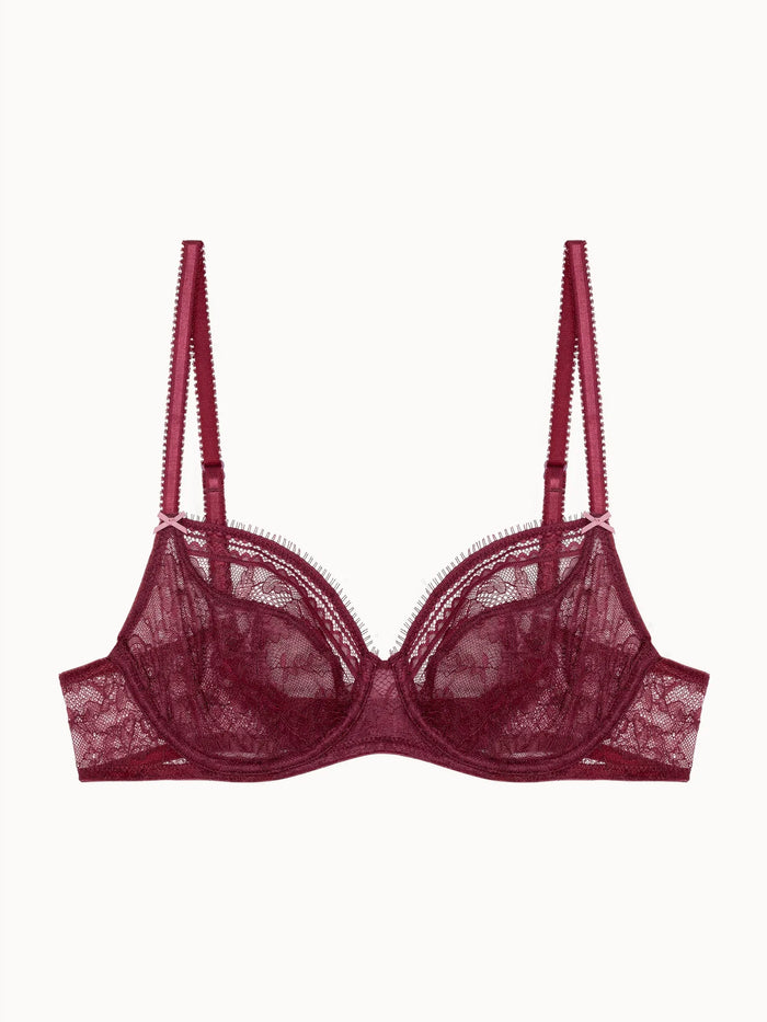 • Σουτιέν χωρίς ενίσχυση, με μπανέλα σε μοναδικό μπορντώ χρώμα. Από πολλή απαλή δαντέλα που δε διαγράφει από τα ρούχα σας.