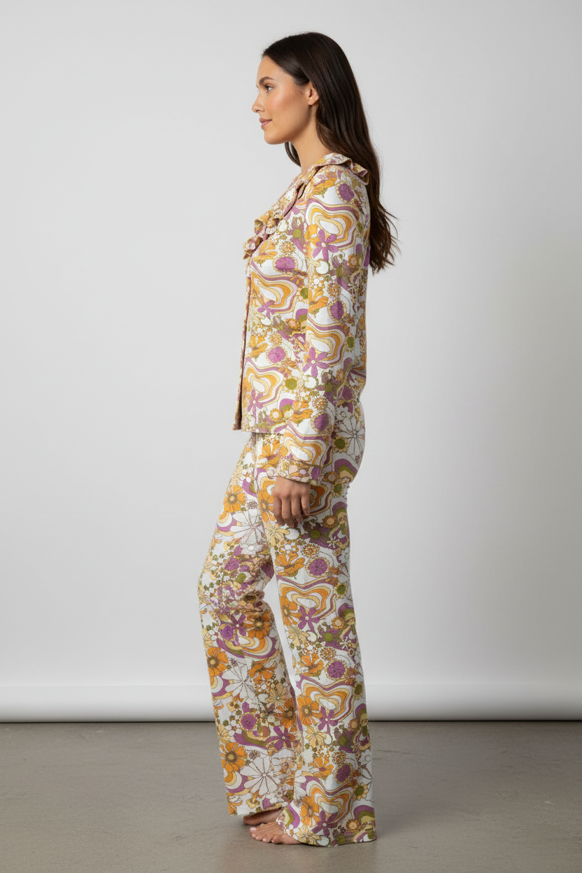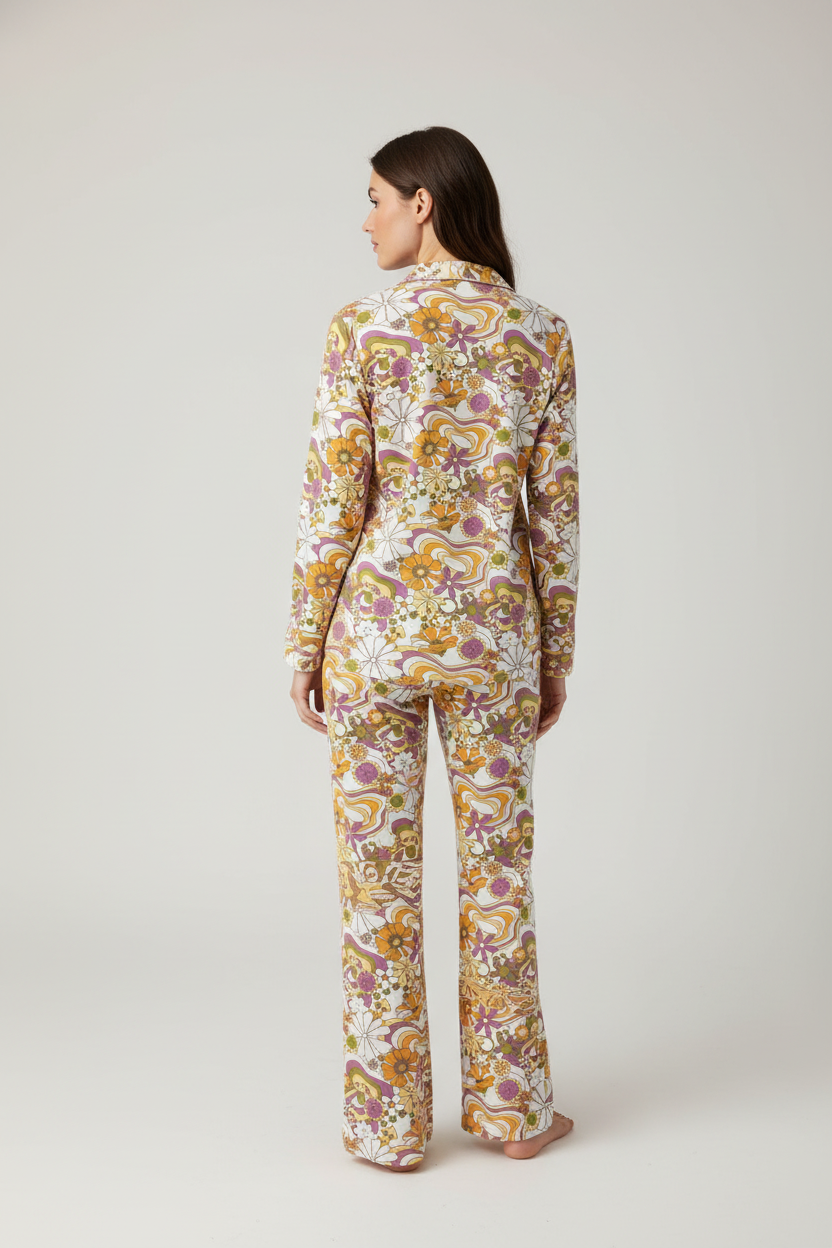 Ένα βαμβακερό σετ πιτζάμας με retro floral print που συνδυάζει άνεση και vintage στυλ. Το χαρακτηριστικό μοτίβο των 70s σε αποχρώσεις μουσταρδί, μωβ και λαδί δημιουργεί μια νοσταλγική και ζεστή αισθητική.