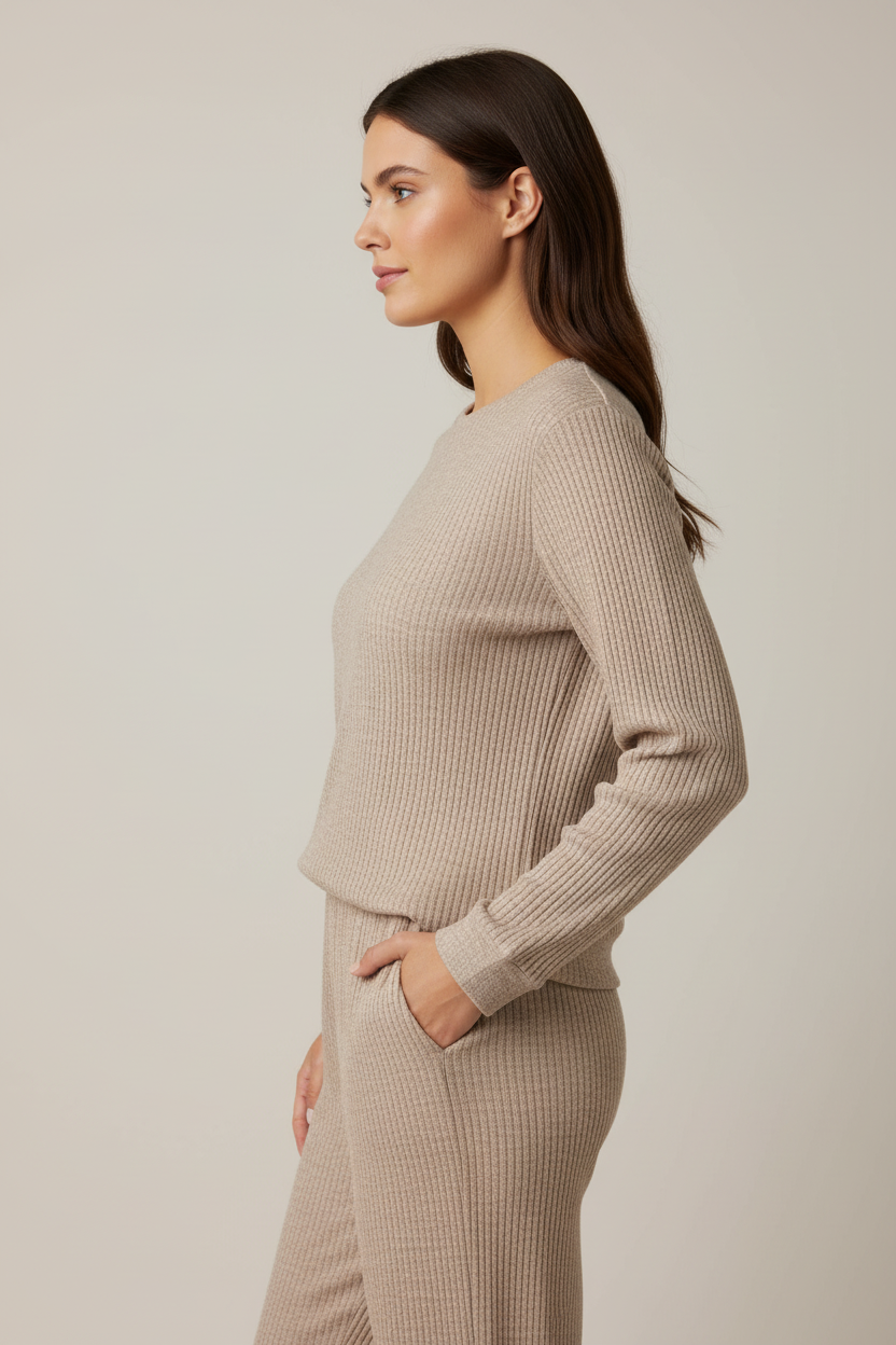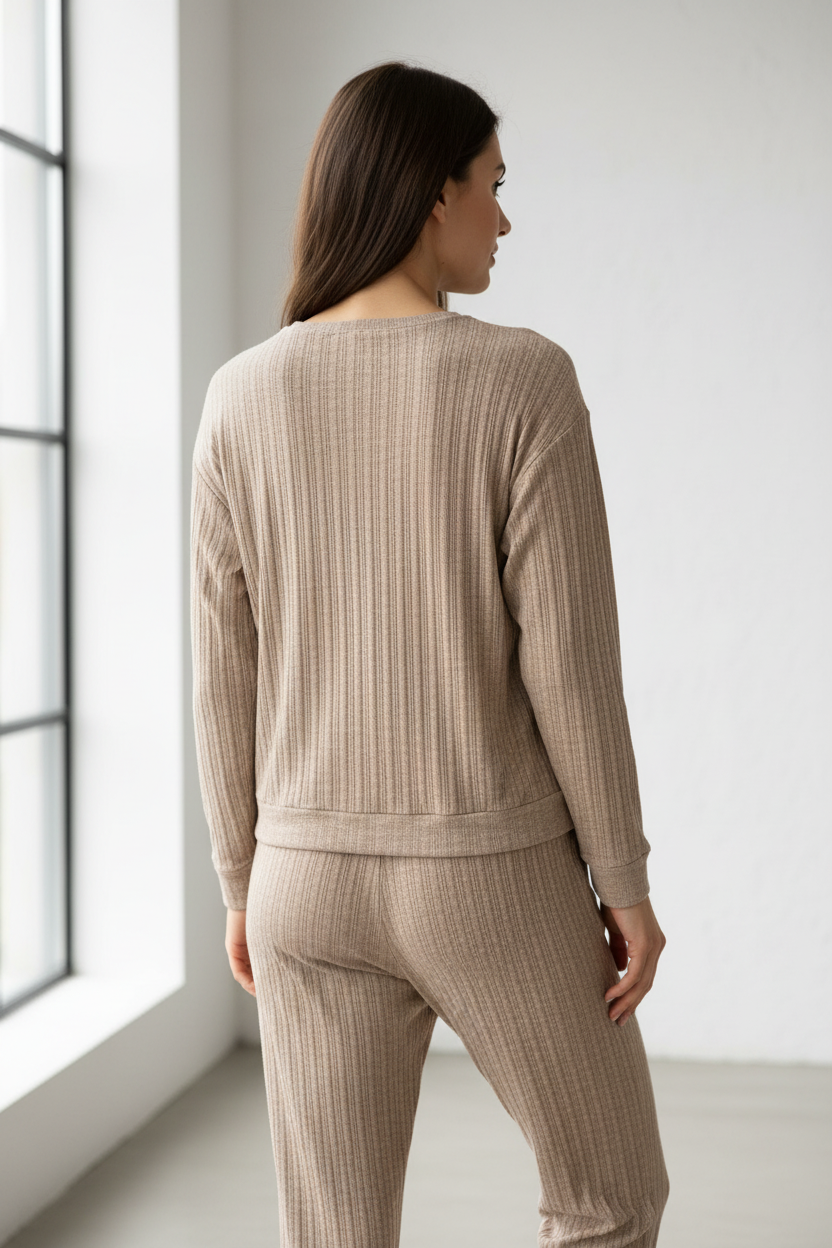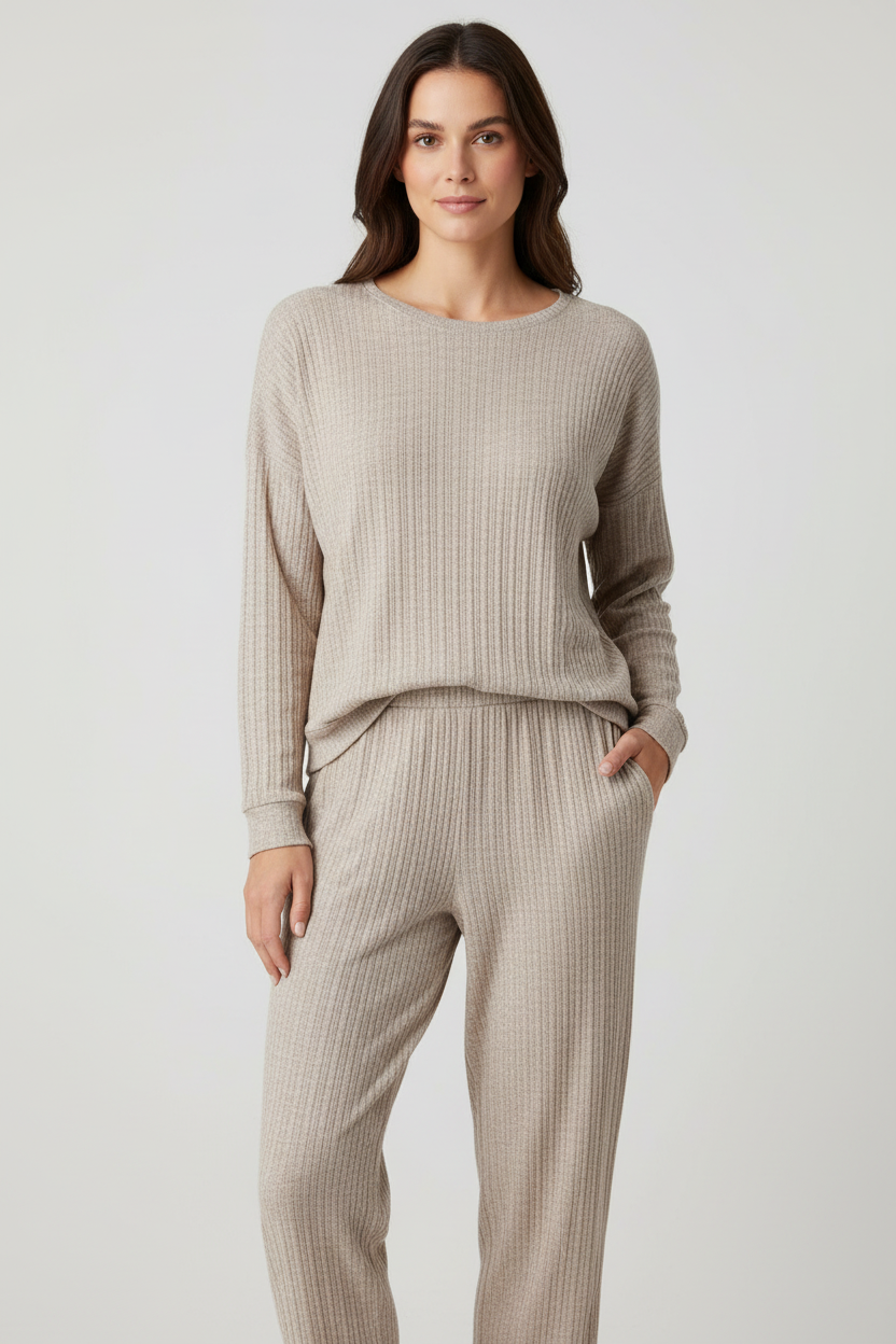 Ένα άνετο πλεκτό σετ πιτζάμας σε μπεζ απόχρωση που συνδυάζει ζεστασιά και στυλ. Η ανάγλυφη πλεκτή υφή προσθέτει χαρακτήρα, ενώ η απαλή αίσθηση του polycotton εξασφαλίζει άνεση όλη τη νύχτα.
