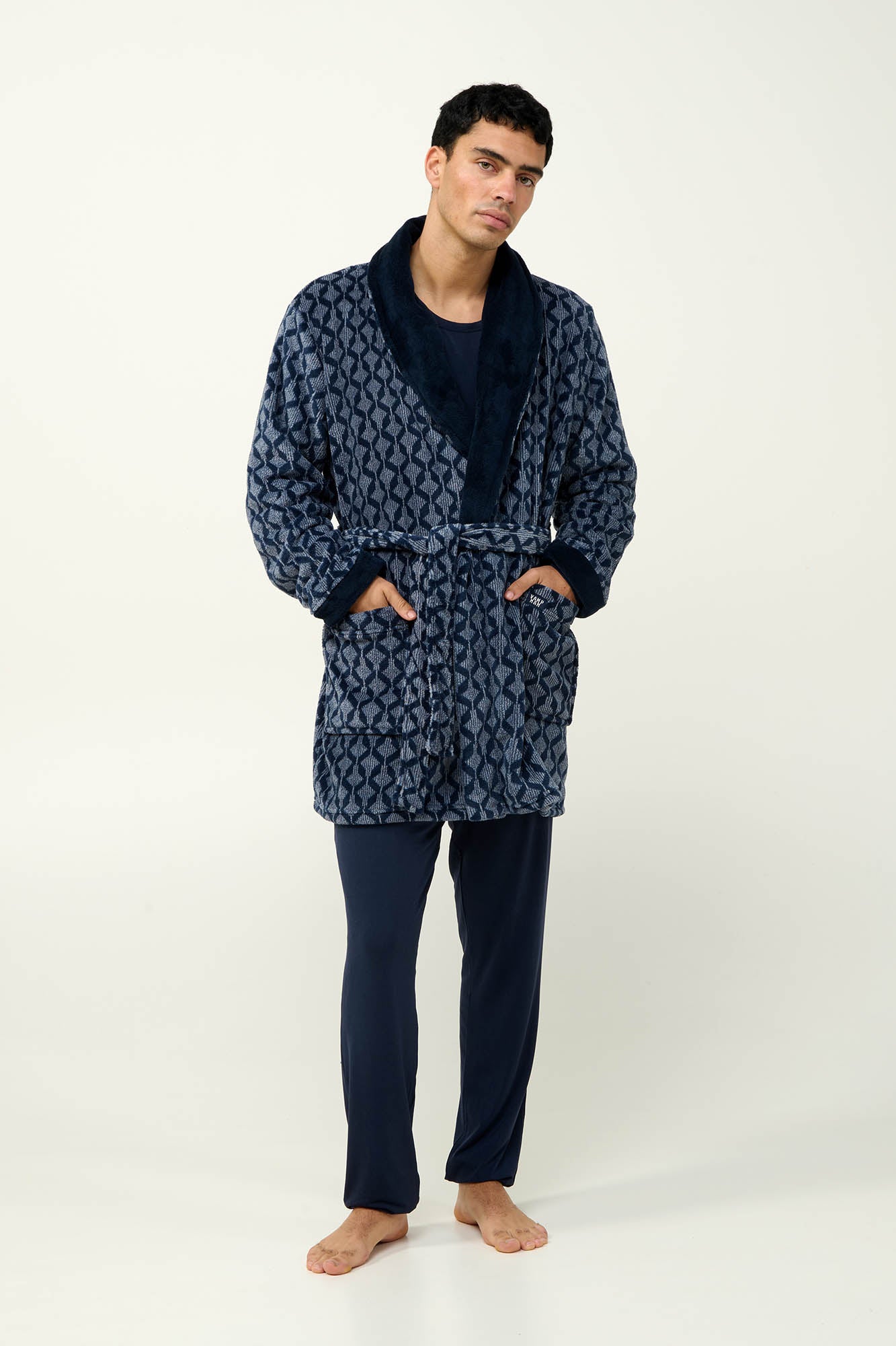 - Μακρυμάνικη ανδρική ρόμπα φλις κοντή. Μοναδικό στυλ με σχέδιο σε μπλε χρώμα.