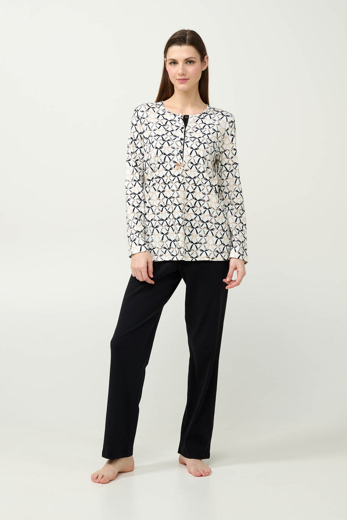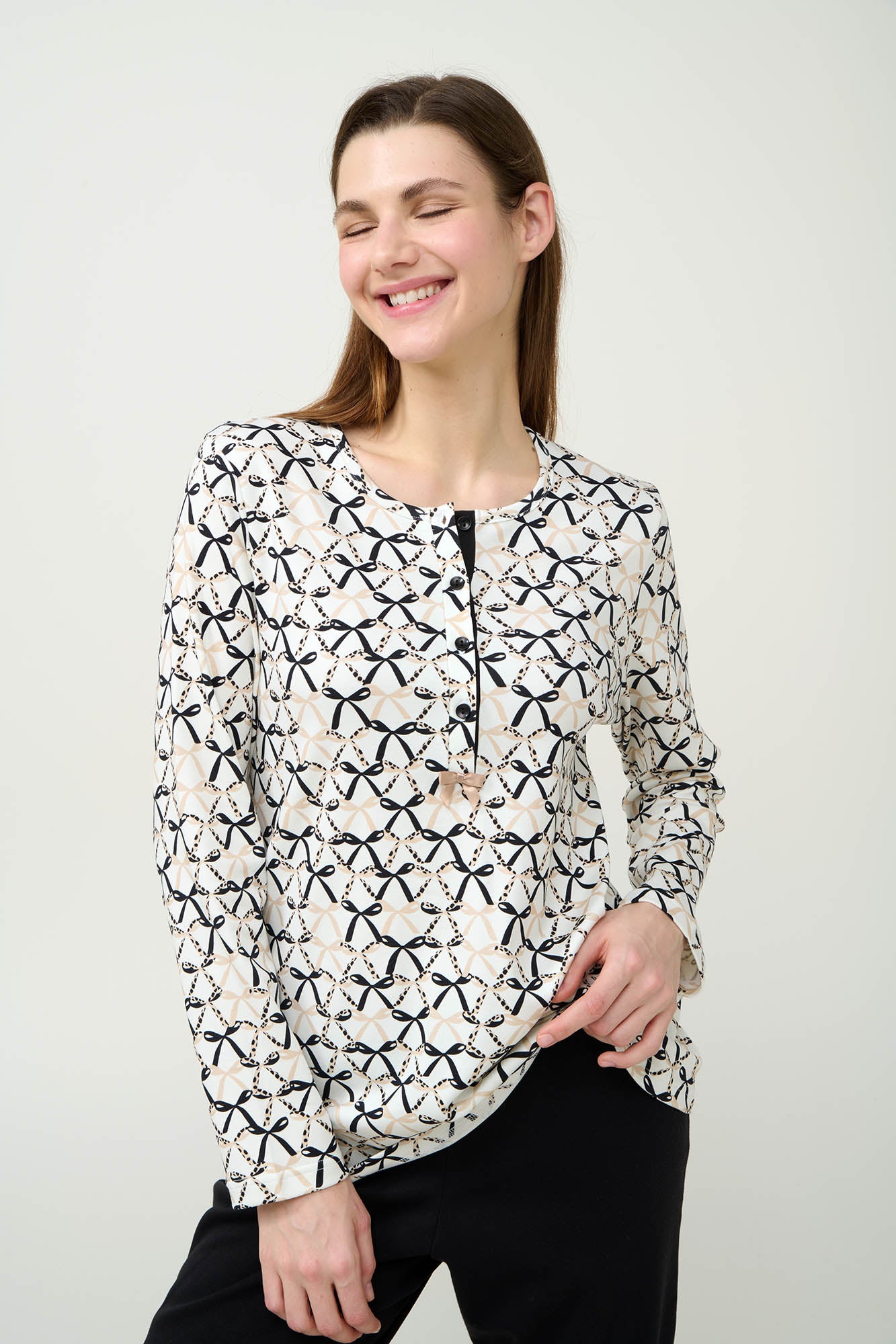 - Μπλούζα: Μακρυμάνικη σε εκρού με σχέδιο φιογκάκια. Διαθέτει 4 κουμπιά.