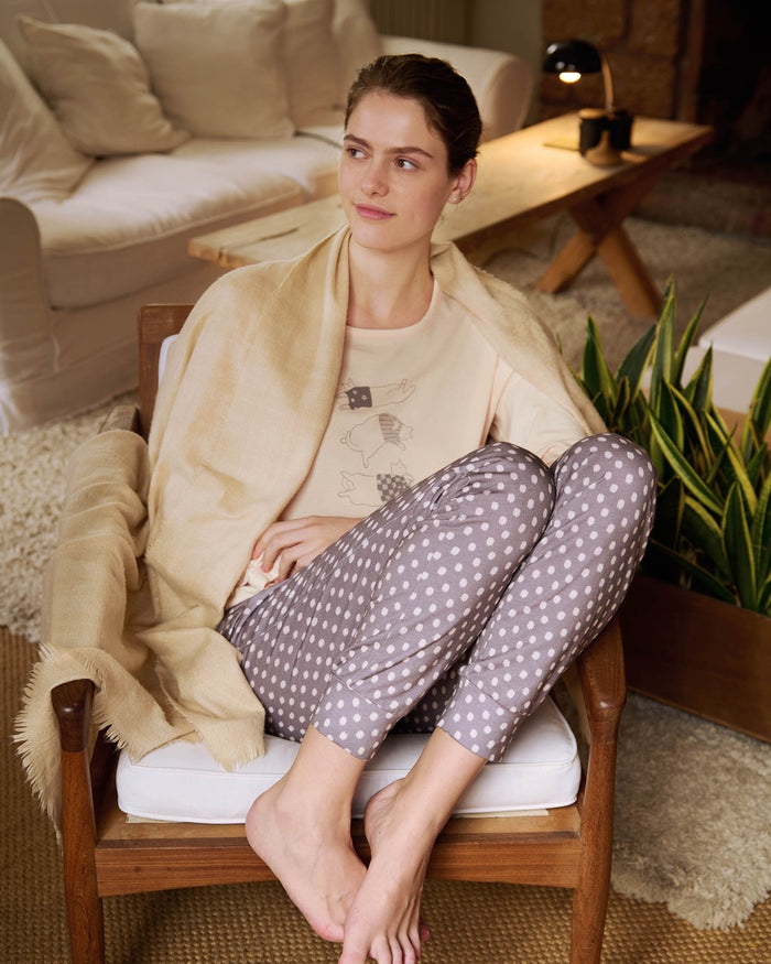 - Παντελόνι: Γκρι πουά, σε ίσια γραμμή με πολύ μαλακό λάστιχο στη μέση.
