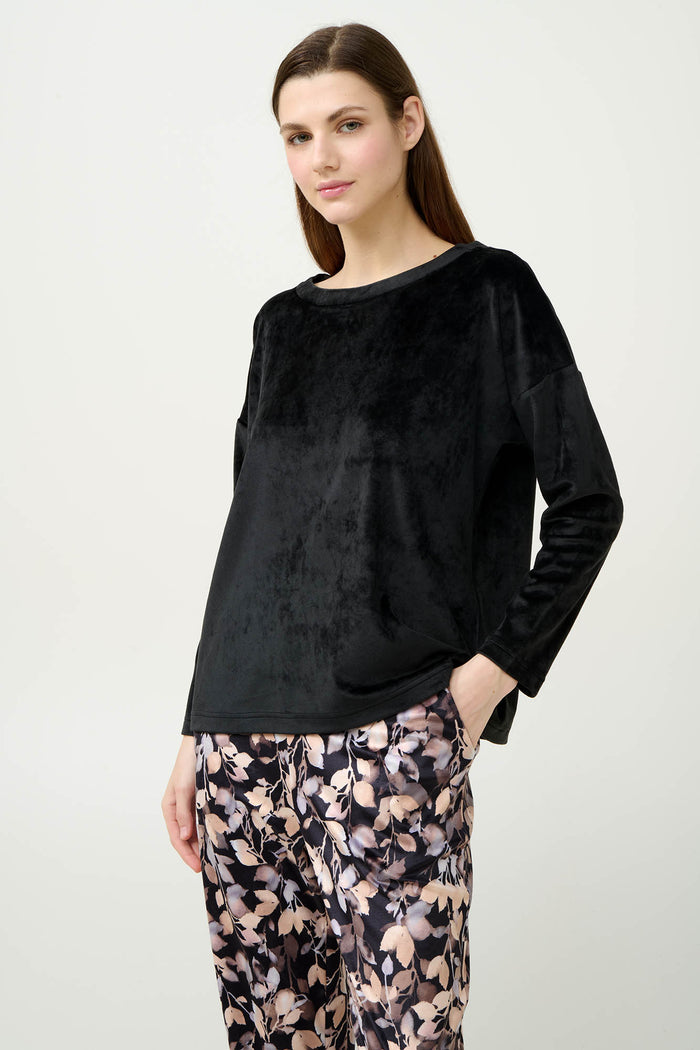 - Μπλούζα: Μακρυμάνικη βελουτέ σε μαύρο χρώμα, για μοναδικό νεανικό στυλ και άνεση.