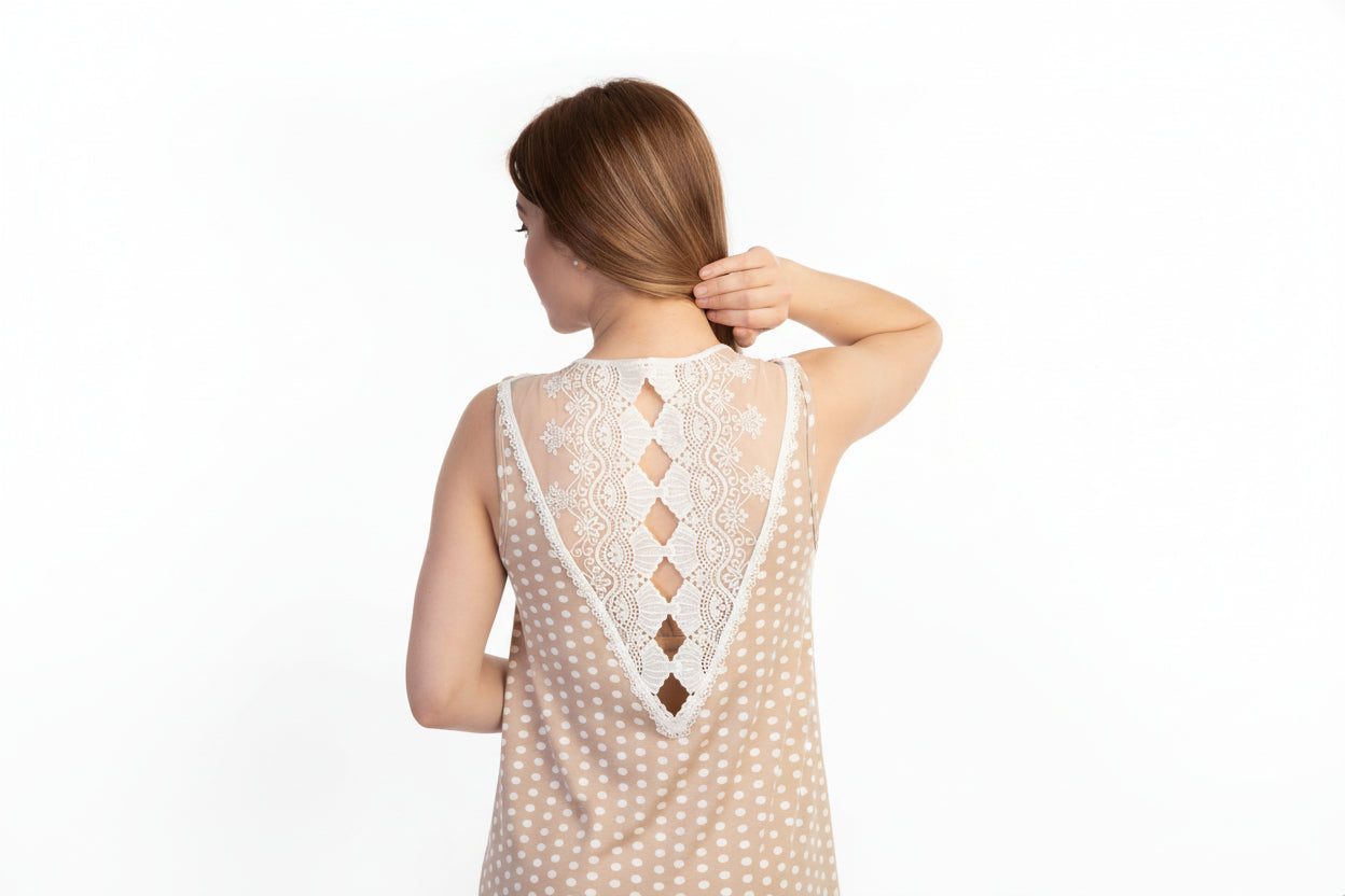 - Μπλούζα: απαλό ύφασμα σε πουά, με δροσερή αίσθηση που αγκαλιάζει ευχάριστα το σώμα και σχέδιο στην πλάτη από εξαιρετική δαντέλα. Αμάνικη με φαρδύ ώμο και λαιμόκοψη χαμόγελο.
