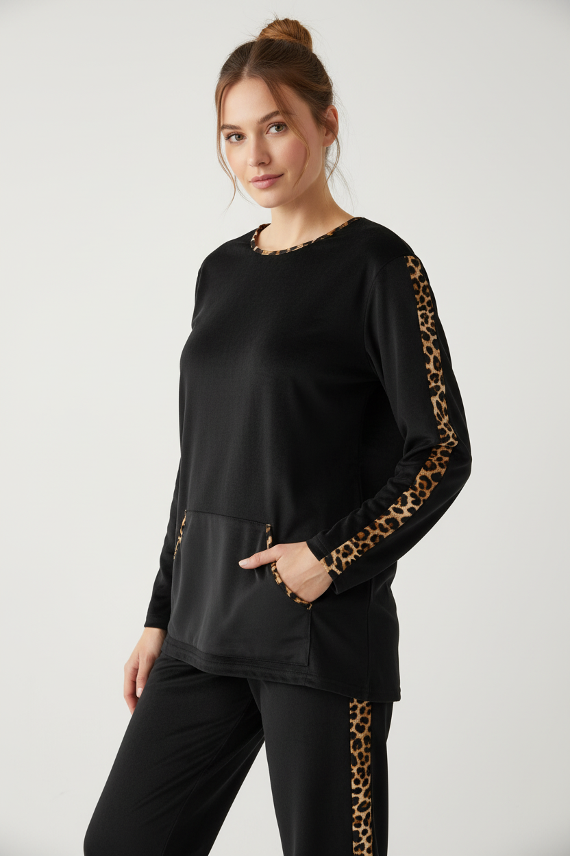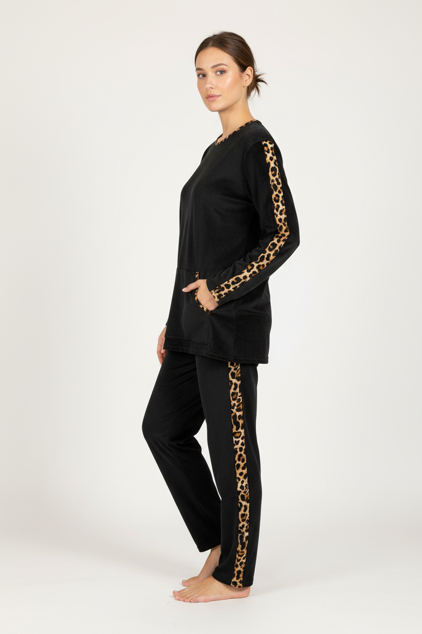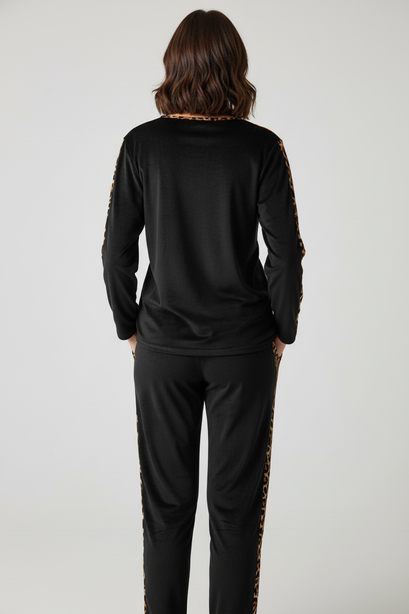Ένα πολυτελές βελούδινο σετ homewear σε μαύρο χρώμα με animal print λεπτομέρειες που συνδυάζει κομψότητα και άνεση. Το απαλό βελούδο και οι leopard λεπτομέρειες δημιουργούν ένα στυλάτο look για χαλαρές στιγμές στο σπίτι.