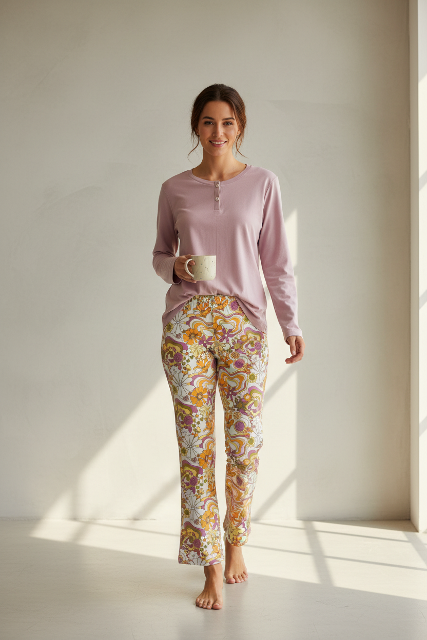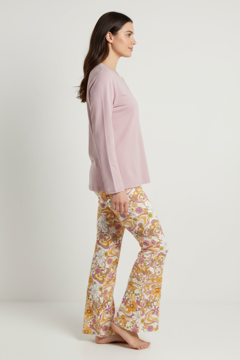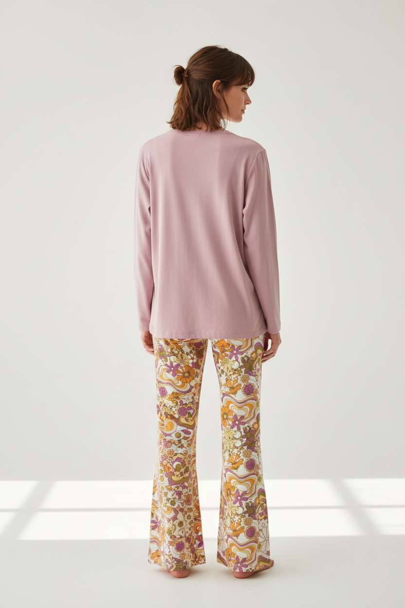 Ένα βαμβακερό σετ πιτζάμας που συνδυάζει το απαλό ροζ με το retro floral print για ένα ρομαντικό και vintage look. Η μπλούζα σε dusty pink και το παντελόνι με το χαρακτηριστικό μοτίβο των 70s δημιουργούν έναν όμορφο συνδυασμό.