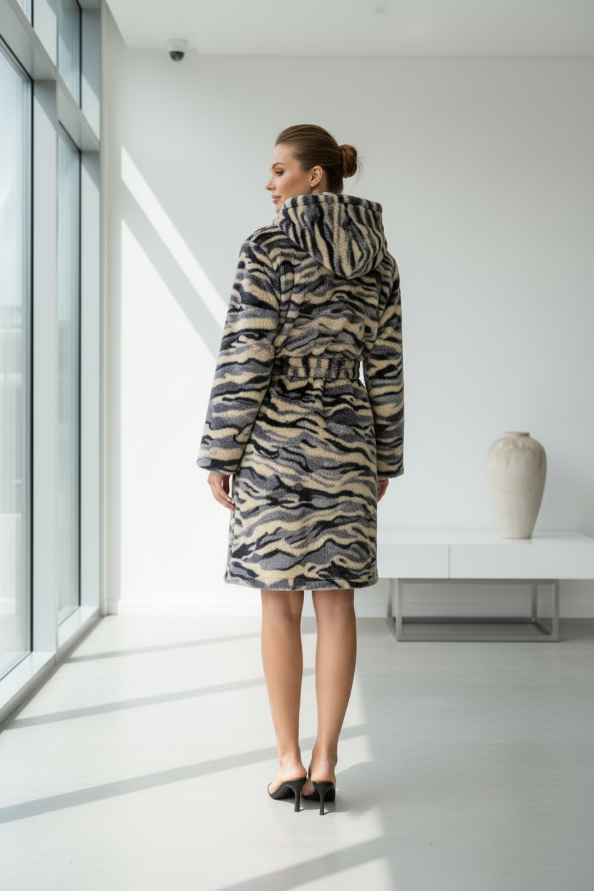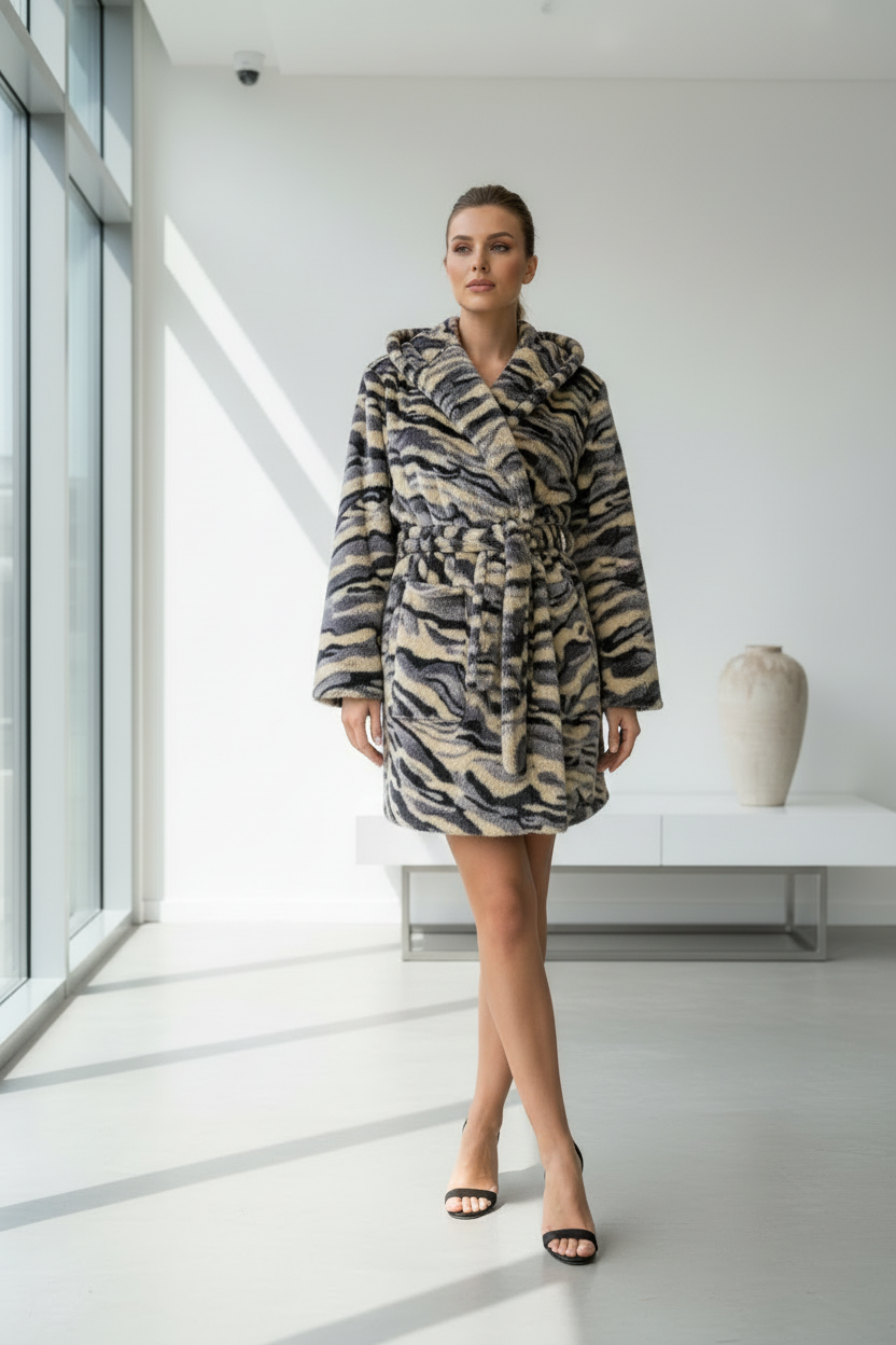 Μια εντυπωσιακή fleece ρόμπα με zebra print που συνδυάζει ζεστασιά και στυλ. Το animal print σε αποχρώσεις γκρι, μαύρο και μπεζ δημιουργεί μια μοντέρνα και τολμηρή αισθητική, ενώ το μαλακό fleece ύφασμα προσφέρει απόλυτη άνεση.