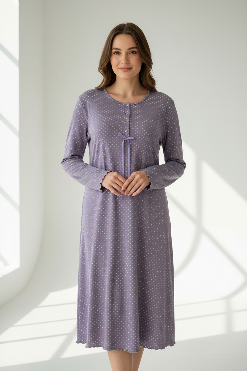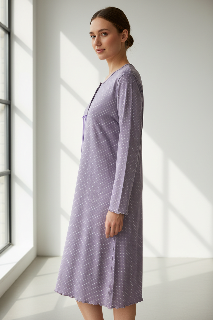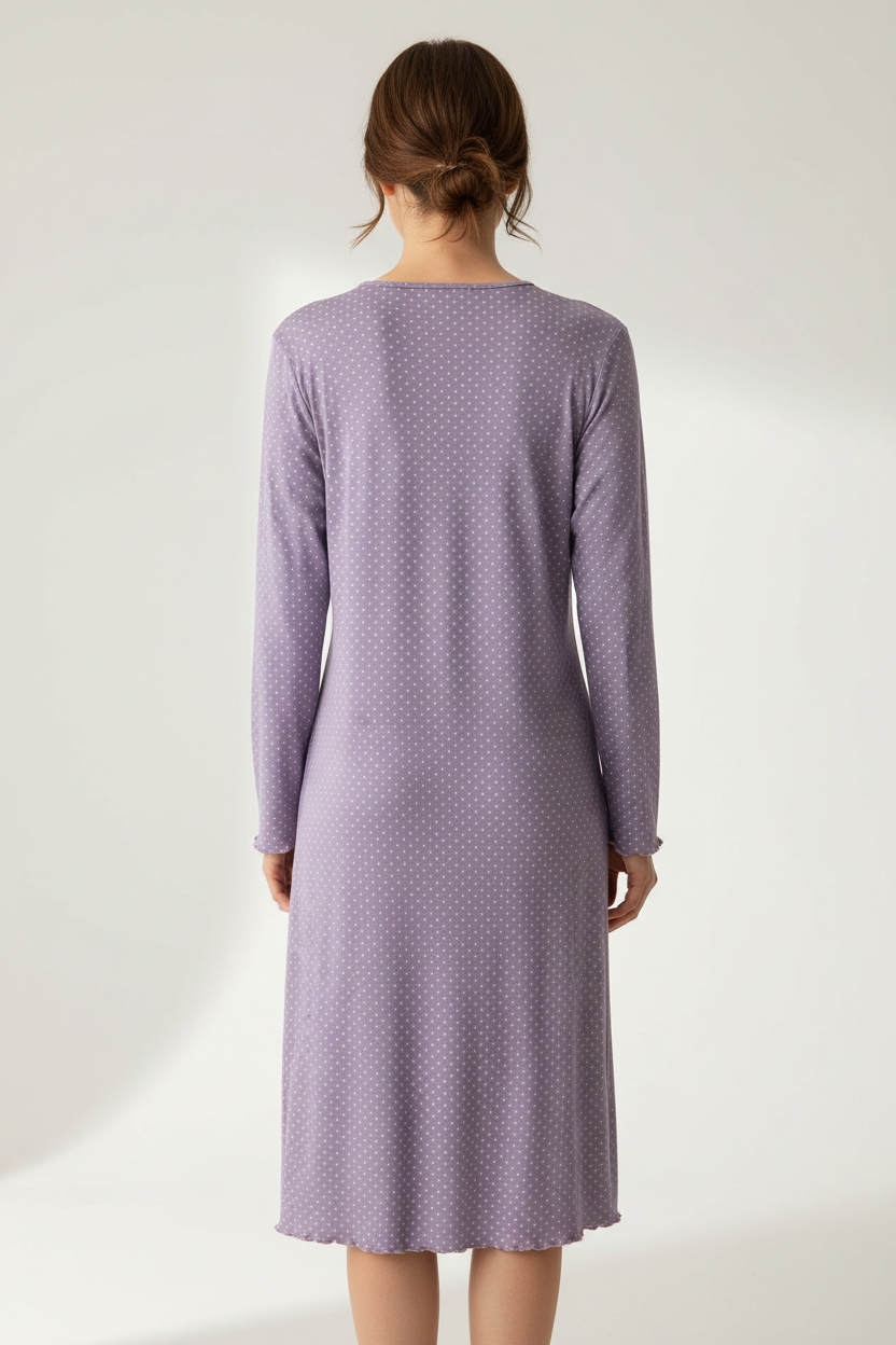 Ένα γλυκό midi νυχτικό σε λιλά χρώμα με λευκά πουά που συνδυάζει θηλυκότητα και άνεση. Τα 4 κουμπιά με το κορδόνι και τα βολάν στις μανσέτες και το τελείωμα προσθέτουν ρομαντικές λεπτομέρειες.